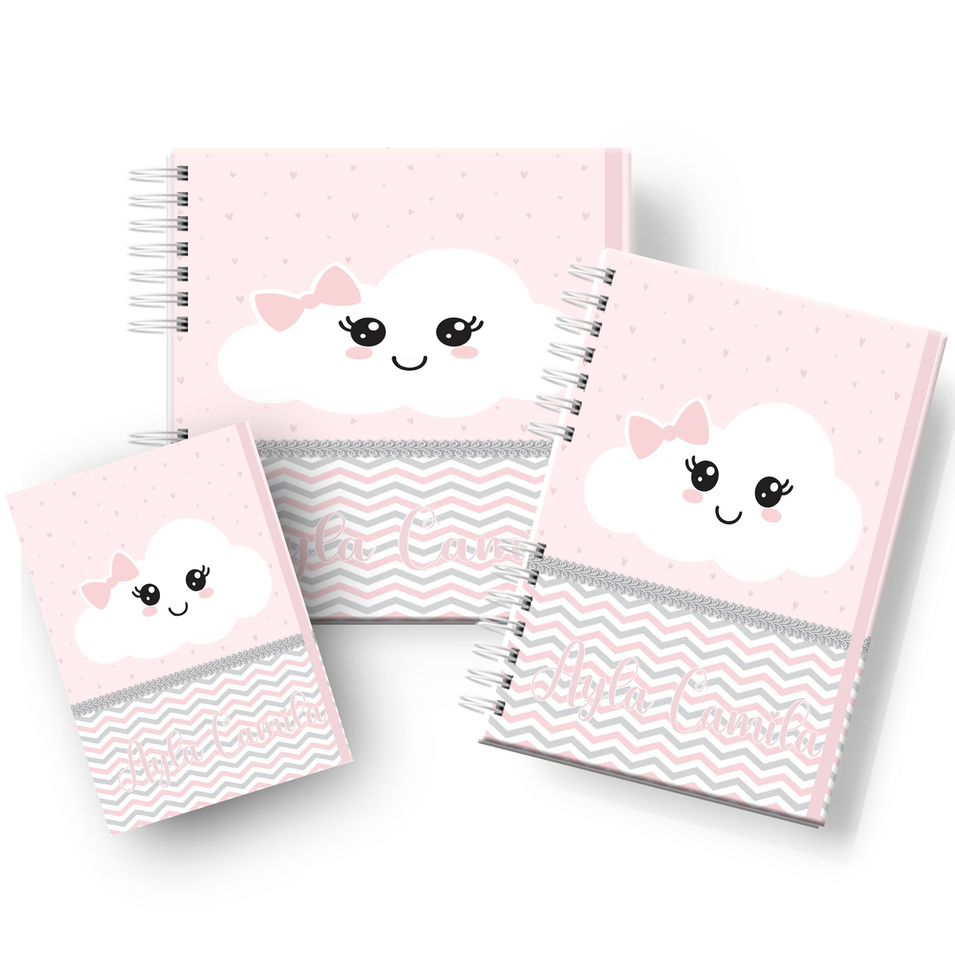 Ele contém uma caderneta de vacinas capa dura, tamanho 16x22cm, 176 folhas com gramatura de 90g, fechamento em elástico, chaveirinho de botton personalizado no mesmo tema da caderneta e um lindo chaveirinho de  pompom.