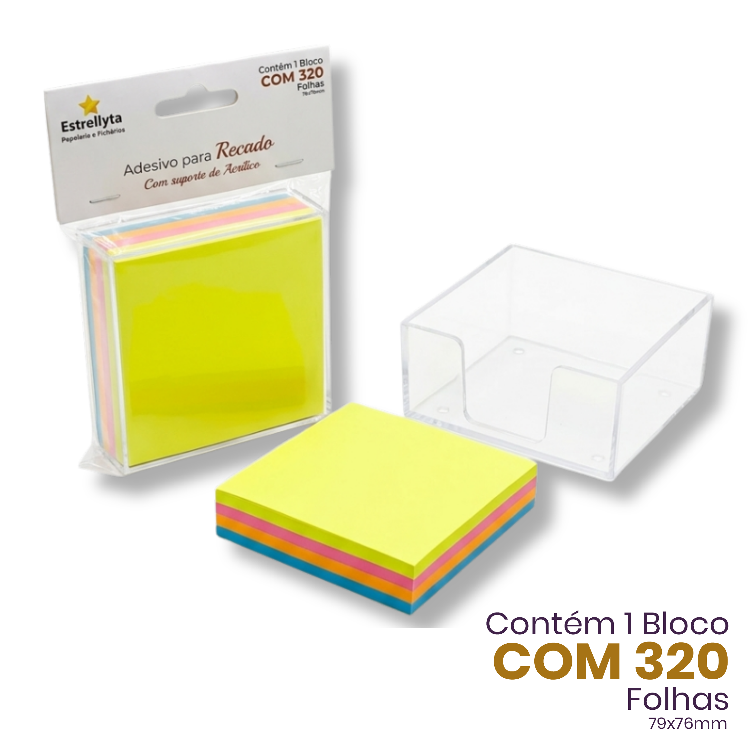 Nosso bloco adesivo estilo post-it acompanha um suporte acrílico moderno, ideal para manter sua mesa sempre organizada.
