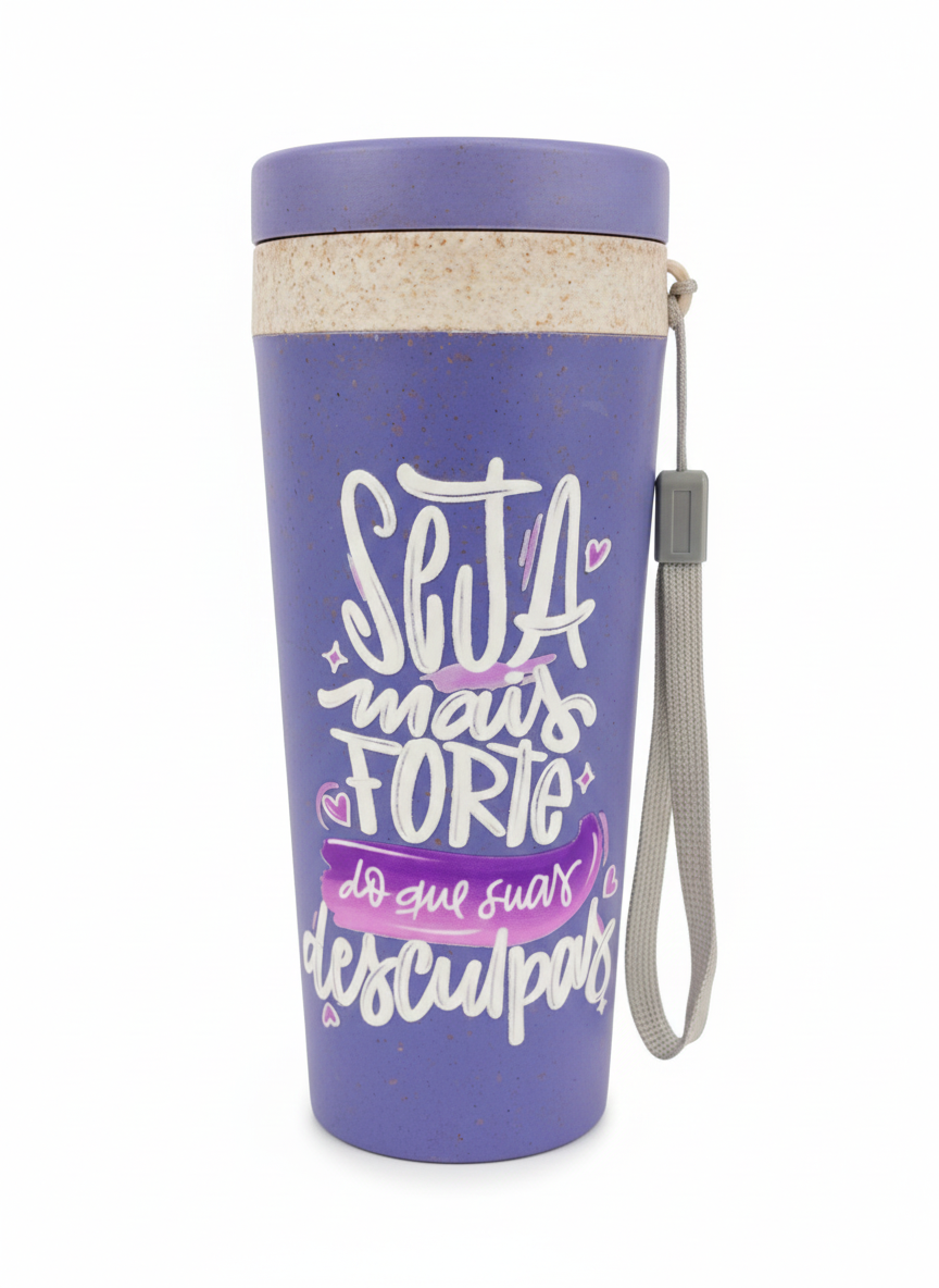 Copo fibra de bambu 350ml com parede dupla e alça. Copo produzido em Polipropileno livre de BPA, possui uma tampa de vedação rosqueável e alça de nylon (removível) para transporte. Conserva a temperatura interna durante um período de 1 à 2 horas, mas não dispõe de isolamento térmico. O copo pode ser levado a lava-louças, geladeiras .