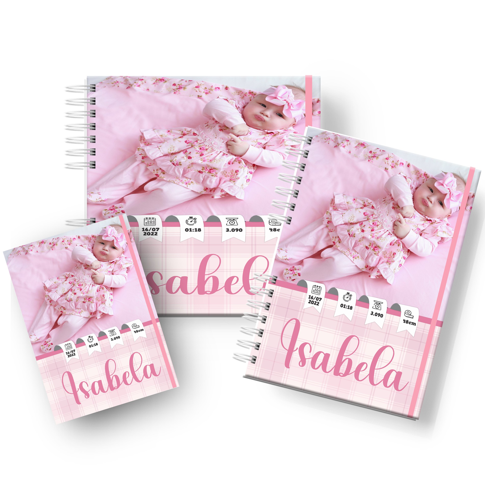 A parte interna possui caderneta de vacinas oficial do Ministério da Saúde atualizada, bolso canguru, dados do nascimento, páginas pautadas para anotações, anotações de consultas, medicações e acompanhamento de mêsvesários.